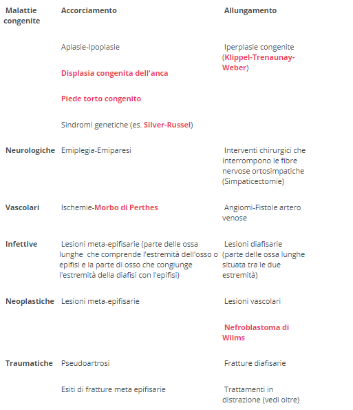 Le malattie congenite che causano eterometria degli arti inferiori sono numerose anche se in alcuni casi, non riuscendo a rilevare alcuna anomalia associata né una causa apparente, possiamo parlare di forme idiopatiche. La storia naturale dell'eterometria dipende dalla malattia che la causa.