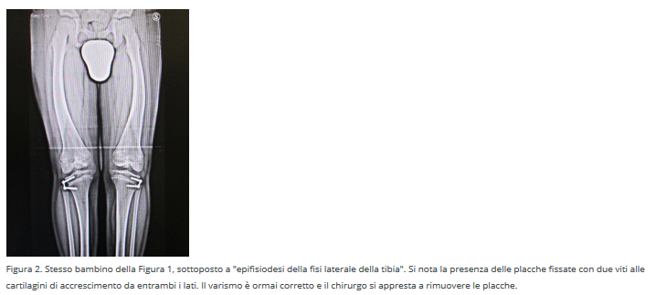 La tibia, il grande osso che si avverte passando la mano sulla parte davanti della gamba, si piega verso l'interno invece di allinearsi con il femore. Di conseguenza le ginocchia si spostano in fuori come si nota bene nella radiografia (Figura 1). SPORT E ORTESI POSSONO AIUTARE Non ci sono prove che la pratica di uno sport piuttosto che di un altro possa correggere il problema. Plantari e calzature (le ortesi) possono essere di aiuto anche se non vi è unanimità di opinioni in merito. Anche per la reale utilità delle ortesi, mancano solide prove scientifiche. QUANDO OCCORRE L'INTERVENTO CHIRURGICO Nel caso in cui la normale evoluzione non migliori la posizione delle ginocchia e non abbiano avuto successo nemmeno plantari e calzature, è necessario passare all'intervento chirurgico. È necessario per ripristinare i normali rapporti tra femore e tibia e per evitare le alterazioni delle cartilagini provocate dallo squilibrio biomeccanico che il ginocchio varo rende inevitabile. In età pediatrica la tecnica chirurgica più utilizzata è l'epifisiodesi. Tale tecnica ha lo scopo di arrestare o rallentare temporaneamente la crescita di una cartilagine di accrescimento del femore, della tibia o di entrambi indirizzando la crescita in senso opposto alla deformità. In genere, per la correzione del varismo si impedisce temporaneamente la crescita della parte esterna della cartilagine di accrescimento della tibia in modo che la normale crescita della parte interna della stessa cartilagine porti a un riallineamento. In termini chirurgici, questo intervento prende il nome di epifisiodesi della fisi laterale della tibia. L'intervento chirurgico è mininvasivo e consiste nell'applicare una placca a otto fissata con due viti a cavallo della parte esterna della cartilagine di accrescimento. I tempi di recupero sono veloci: le placche si mantengono fissate alla cartilagine di accrescimento fino a correzione ottenuta (Figura 2).